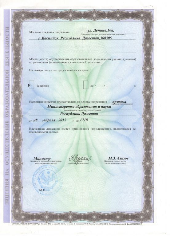 Адрес местонахождения образовательной организации* 368300 РД г. Каспийск ул. Ленина 10 а